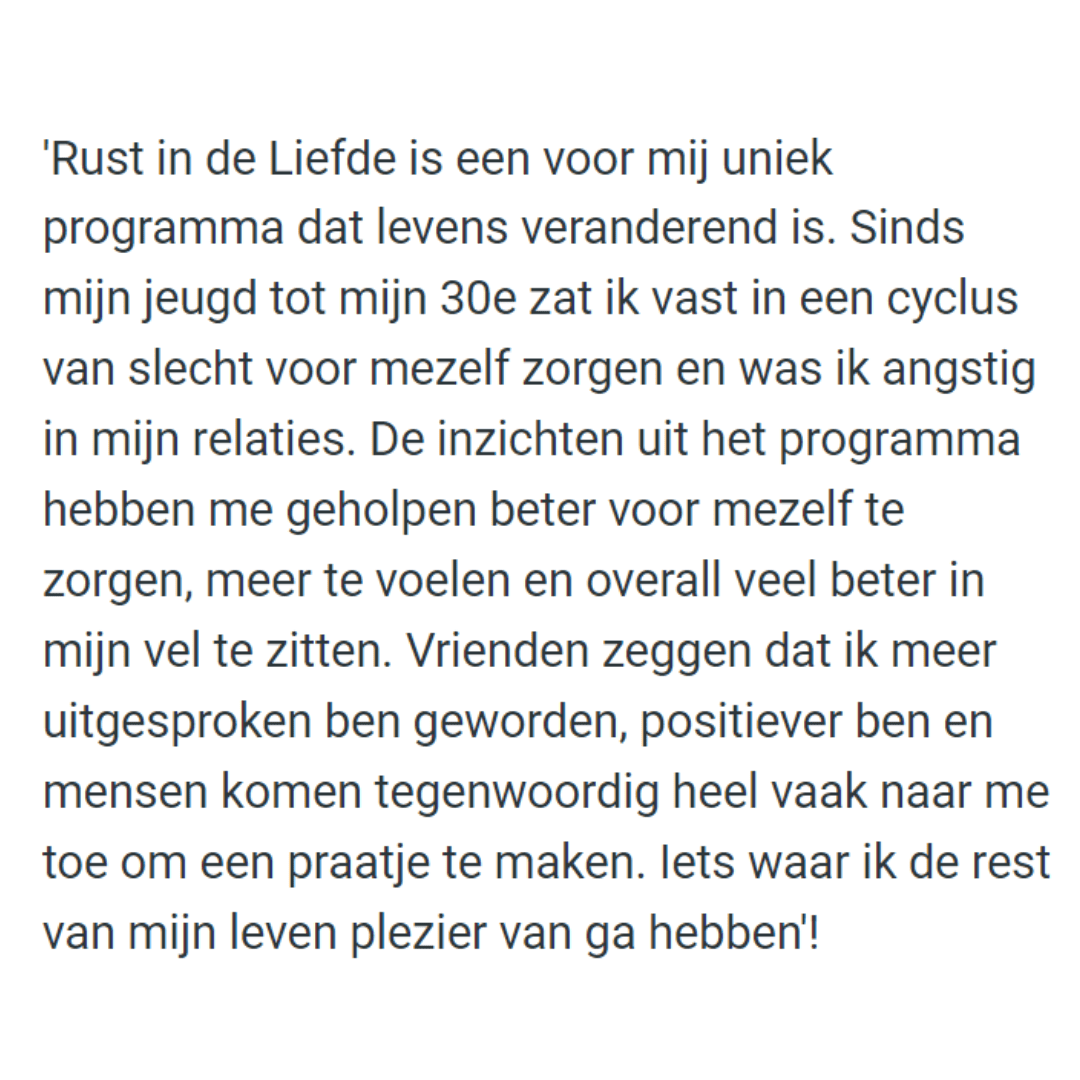 Je leert hoe je gaat van angst naar rust. In je hoofd, in je lichaam en in je relatie.