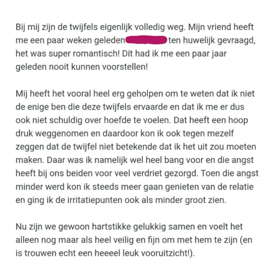 Er zijn bijvoorbeeld veel psychologen die niet weten dat twijfel ook hele andere oorzaken kan hebben dan dat de relatie niet goed is. Het was een drempel om zó open te zijn over mijn eigen twijfel en mijn hele reis naar waar ik nu ben, maar toen ik een keer 's avonds in bed lag en me herinnerde hoe eenzaam en onbegrepen ik me voelde, besloot ik dat ik dat niet wilde voor jou.
