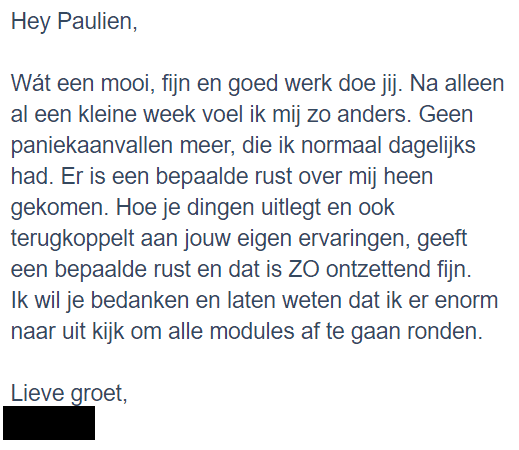 Als je meer begeleiding wil kun je binnen het programma altijd een afspraak maken met onze huispsycholoog Kelly tegen een gereduceerd tarief. Zij is gespecialiseerd in angst, dwang en trauma en kan je heel goed helpen als je behoefte hebt aan meer begeleiding! Ze werkt via Skype, dus het maakt niet uit waar je woont!