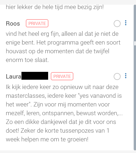 Je krijgt toegang tot verdiepende masterclasses, om twijfel nog beter te begrijpen en meer te leren over je gedachten, je gevoel en wat de oorzaken van twijfel kunnen zijn. Je vindt hier de masterclasses 'Diepe Heling', 'Love Source Verdieping', 'Van Twijfel naar too good to be true' en 'Je ex loslaten'.
