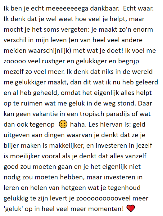 Weet je dat dit een typische twijfelgedachte is? Het zorgt er namelijk voor dat je IN de twijfel blijft. Als je niets doet om de twijfel te doorbreken, zal je blijven twijfelen. Daarnaast: dit programma is voor een heel groot gedeelte gericht op het oplossen van de dieperliggende angsten en belemmerende overtuigingen en het vergroten van zelf-liefde. Daar heb je altijd wat aan.